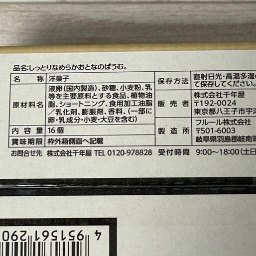 液卵(国内製造)、砂糖、小麦粉、乳等を主原料とする食品、植物油脂、ショートニング、食用加工油脂/乳化剤、膨張剤、香料(一部に卵・乳成分・小麦・大豆を含む)